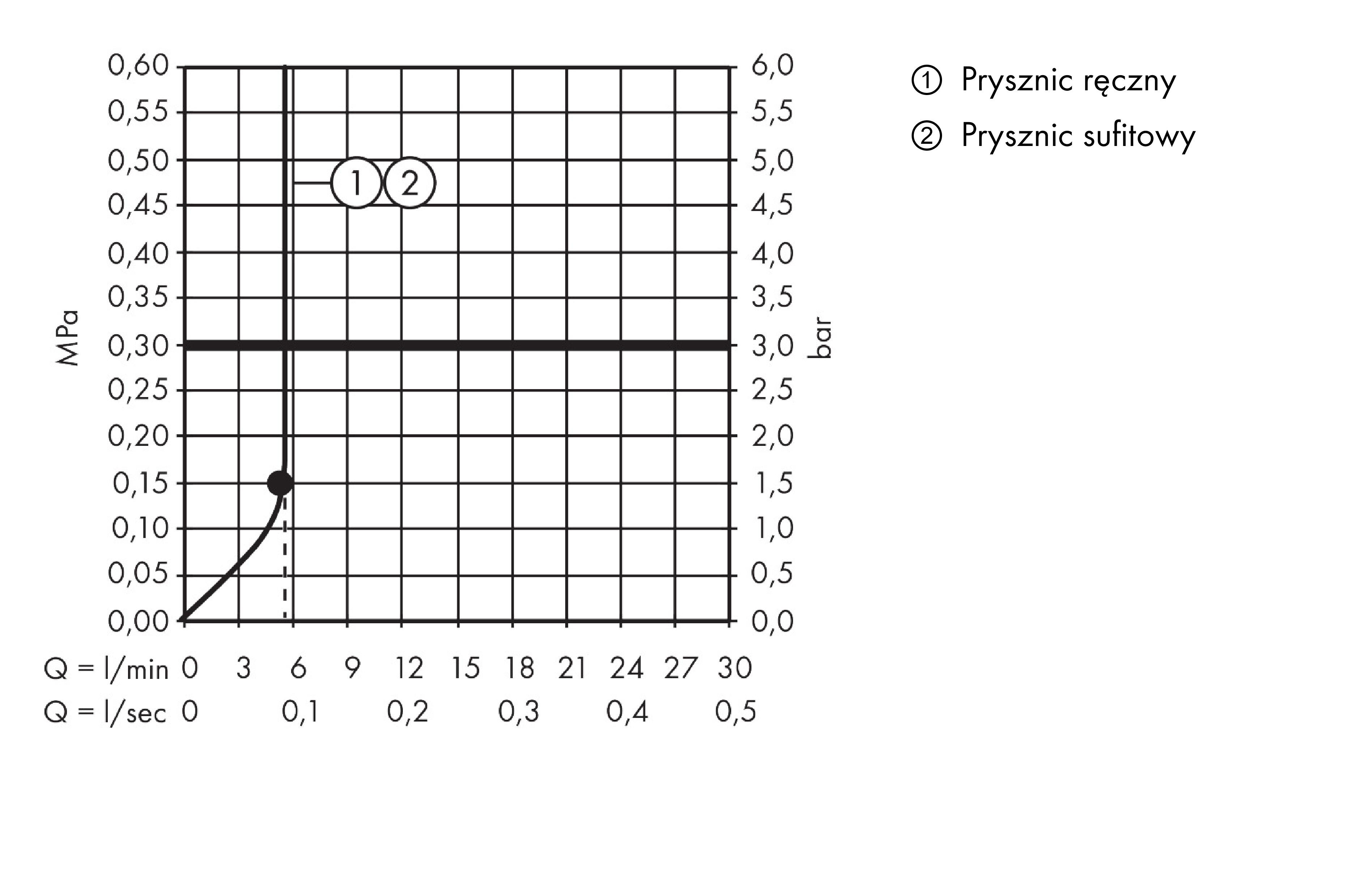 - maksymalny przepływ główki prysznicowej przy 3 barach: 5,3 l/min